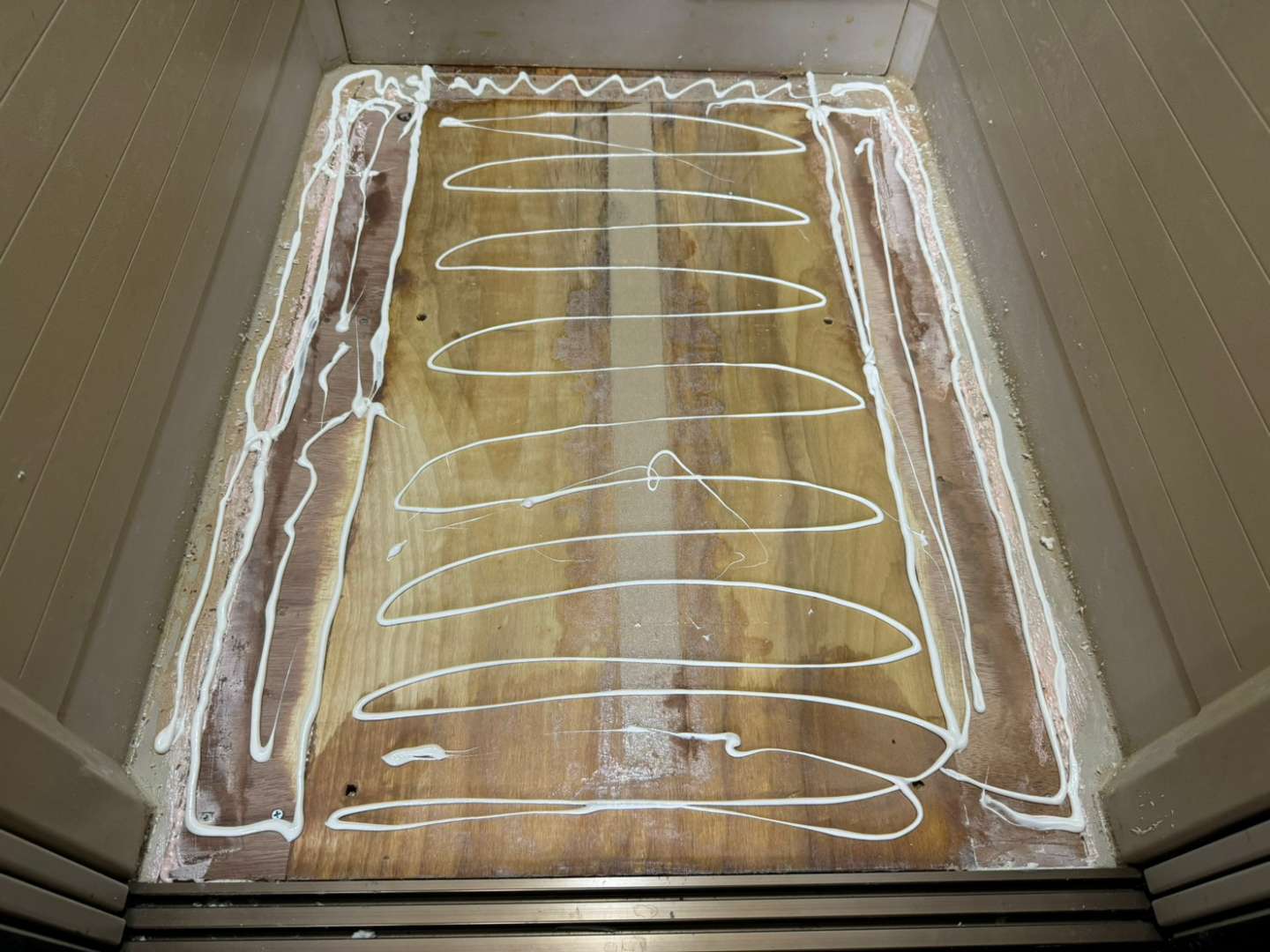 車椅子のタイヤと接する部分の下地をウレタン構造から構造用合板へ変更、更にその上に1枚ものの耐水合板を貼付け強度を上げました。仕上げにCFシートを施工し工事を完了させました。